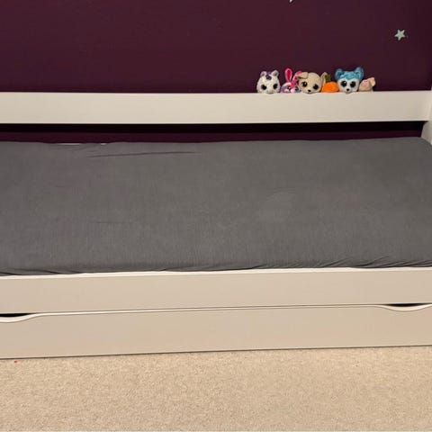 Praktisk juniorseng med stor opbevaringsskuffe sælges.
