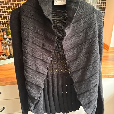 Cardigan fra Skovhuus "Chanel" design helt sort med sorte knapper med guldkant. 30 % uld og 70 % acryl.