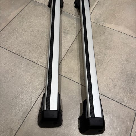 Volvo tagbøjlerne fulgte med bilen da vi købte den, men vi har aldrig brugt dem. Længde 125 cm. JEG VED IKKE hvilken model de passer til. Se sidste billeder. Men de passer ikke til V70 fra sen 2008 - den sidste svensk producerede model. Taggrebene kan byttes med andre.