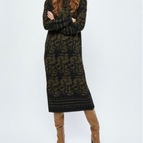 Dejlig strik kjole nærmest som en lang langærmet trøje med løs rullekrave. Rød- grå -sort. Bomuld 45 pct og acryl 55 pct. kan vaskes ved 40 grader. længde 93 cm.