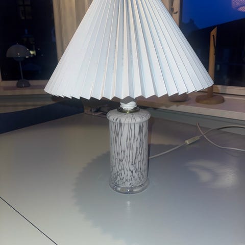 Super fed retro lampe, I glas. Hvis man er fix på fingrene, kan man måske lirke fatningen af, så man kan komme fx julepynt, kogler, mv, ned i lampefoden, og sætte fatningen på igen. Så har man den fedeste julelampe!