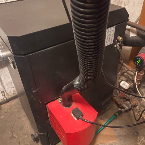 Stoker. Automatisk pillefyr. Udstyret med kontrolpanel til styring og overvågning, motor til automatisk drift samt robust konstruktion i stål. Velegnet til opvarmning i større bygninger eller industrielle miljøer. Leveres uden yderligere tilbehør.