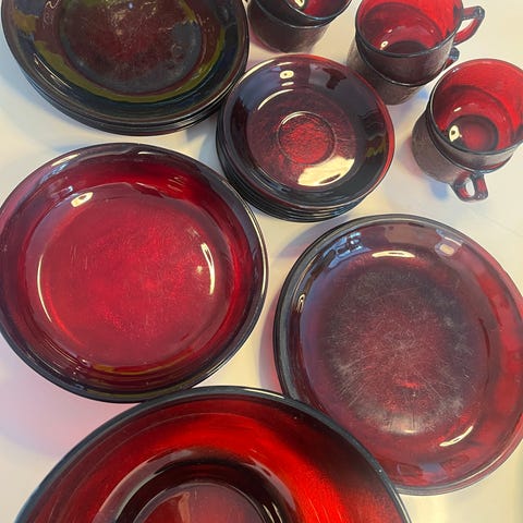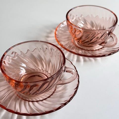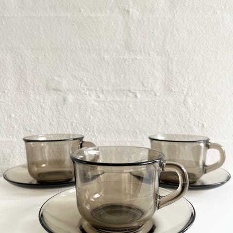 Glaskop med underkop og kagetallerken – Arcoroc Sierra i fineste ravgule farve. Ren retro.