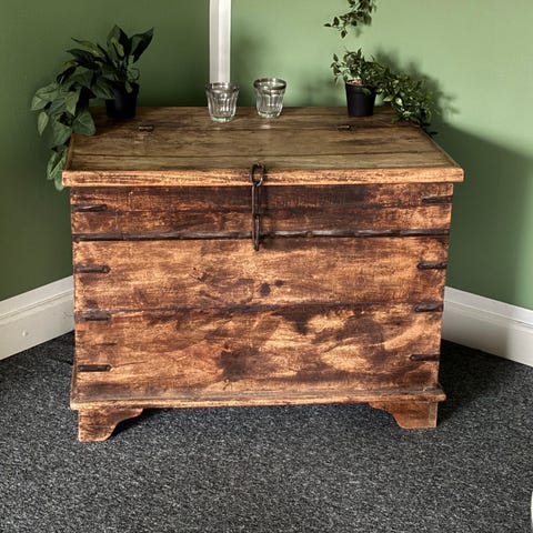 Flot gammel dragekiste i trælook og hvid malet indvendigt.