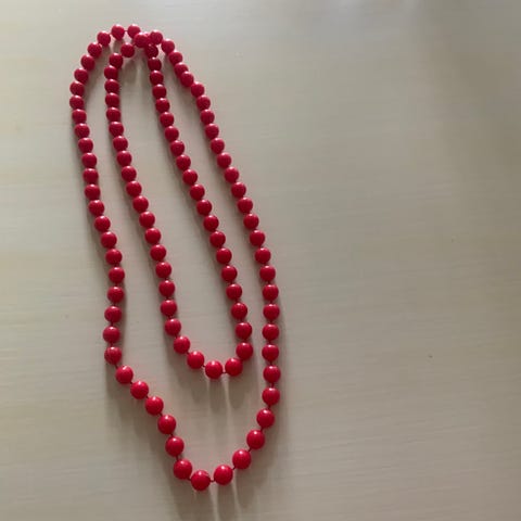 Halskæden og armbåndet er hjemmelavet og fremstillet i gummiringe og øskner af rødt aluminium.