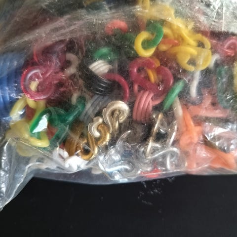 En stor pose blandet ældre hønseringe. Der er nogen med brugsspor og der kan være knækkede imellem selv om jeg har prøvet at sortere dem fra. Der er lige knap et kilo (960gr). 300kr. Ishøj.