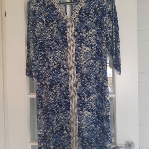 Kjolen er knælang, har 3/4 ærmer samt lynlås i ryggen.