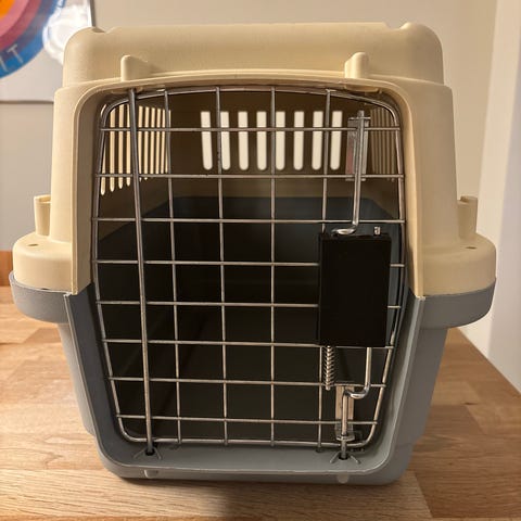 Et handy bur, god størrelse, let at transportere, kan klappes helt sammen, Aluminium bund. 1 bur med låge i front og side,og yderligere 1 bur kun med låge i front Mål: L 75 cm - B 65 cm - H60 cm