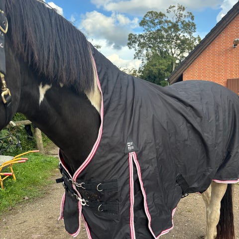 Fint mørkeblåt regndækken i str. 145. Det er brugt en sæson. Mangler snoren til ved halen, men fejler ellers intet. Ukendt mærke.