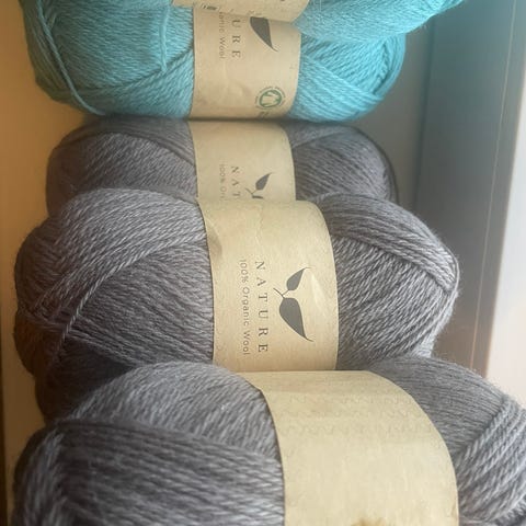 50%økologisk uld og 50% økologisk bomuld. Riktig godt garn å strikke med.