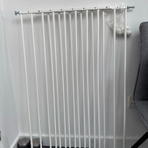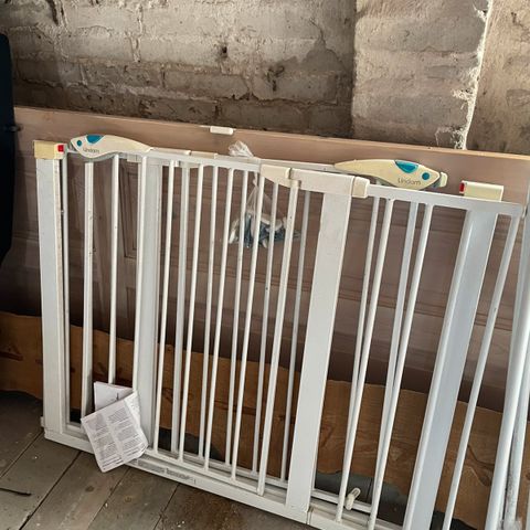 Tre stk træ sikkerhedsgitter designet til brug ved trapper eller døråbninger. Gitteret er lavet af lyst træ og har lodrette tremmer. Det kan monteres for at forhindre adgang, typisk brugt til at sikre børn eller hunde. Passer til bredder som kan justeres inden for en vis ramme. Gitteret er egnet til indendørs brug og kan monteres på væg eller dørkarm.