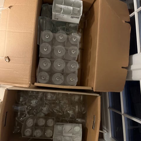 Glasbesætning 24 røde glas på fod, rigt dekoreret med håndmalet blomster og guldfod 12 vinglas 6 likør og 6 stk. cognac sender gerne mod porto