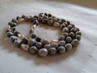 Halskæde, bijouteri, Halskæde med lys blå bønner skiftevis med bitte små glas perler og prydet med dråbe formet perlemors farvede perler.