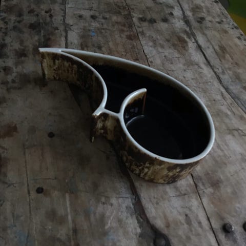 Smuk ikebana vase i blåmeleret glasu udvendig og gylden brun indvendig, ingen fejl afslag skår, i flot stand. Cirka 13, 5 cm når man måler de 3 sider udvendig og 8,5 cm på det højeste, kender ikke signatur.