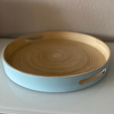 Helt ny og ubrugt rundt bambusfad. Indersiden er bambus, ydersiden er i lyseblå. Størrelse Ø40. Originalpris er 250 kr.