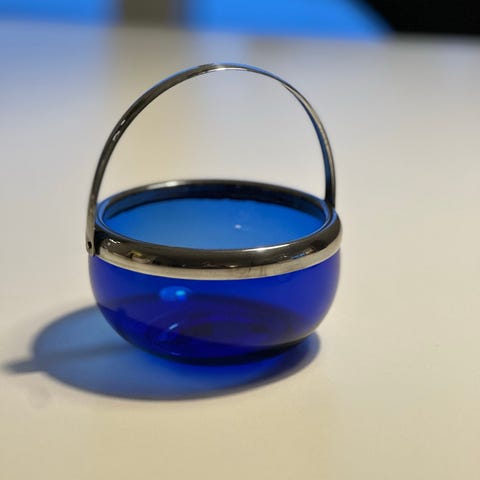 Sælger denne super smukke blå sukkerskål på fod. Perfekt på julebordet med konfekt eller til fødselsdagen med skumfiduser eller guf. Eller måske en hyggelig dag i kolonihaven, med chokolader i, til kaffen..
