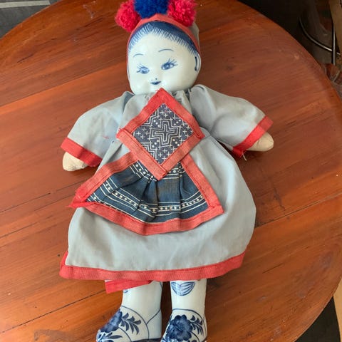 Kan skifte parykker. Det ene ben sidder løst. Den lille parasol som følger med skal repereres.