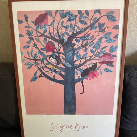 Signeret kunstplakat af Julie Kjer fra 1989. “Udsigt fra det blå værelse”.