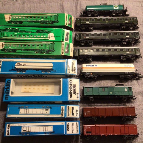 To fine Märklin vogne, en kølebananvogn designet til Deutsche Bundesbahn (DB) samt en Märklin HO 306 klassisk stykgods.