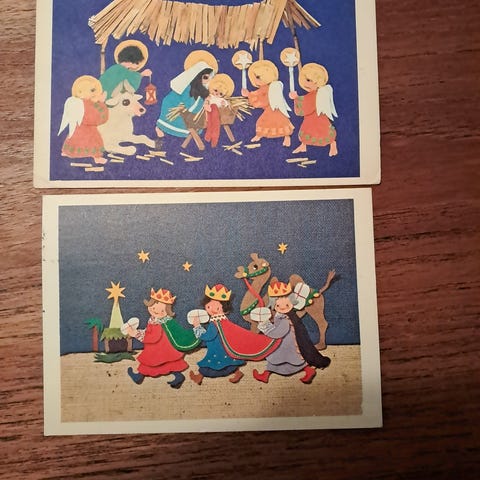 Vintage postkort med julemotiv. Flerfarvede illustrationer trykt på papir. Ideel til samlere eller som dekoration i hjemmet. Kortene viser forskellige julemotiver og er forsynet med håndskrevne beskeder og frimærker. Perfekt til dem, der værdsætter historiske og nostalgiske genstande.