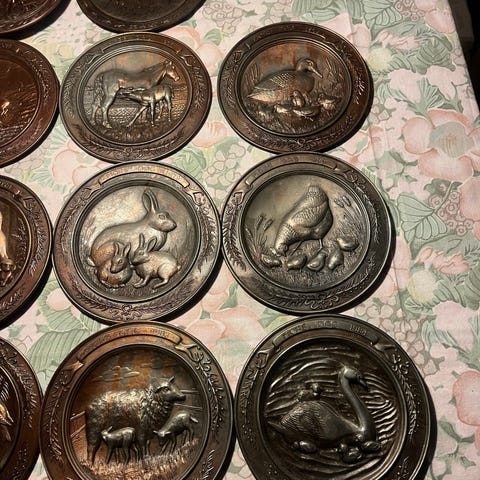 Platterne er lavet af porcelæn med underglasurmaling i blå og hvid og de har en diameter på 13 cm.