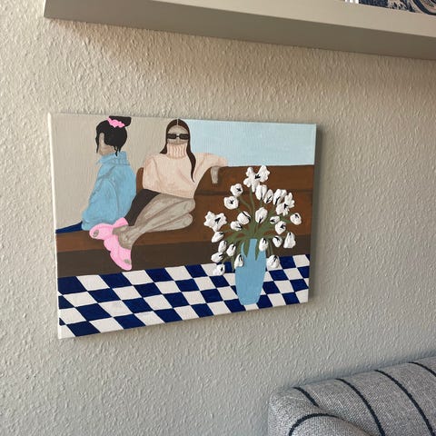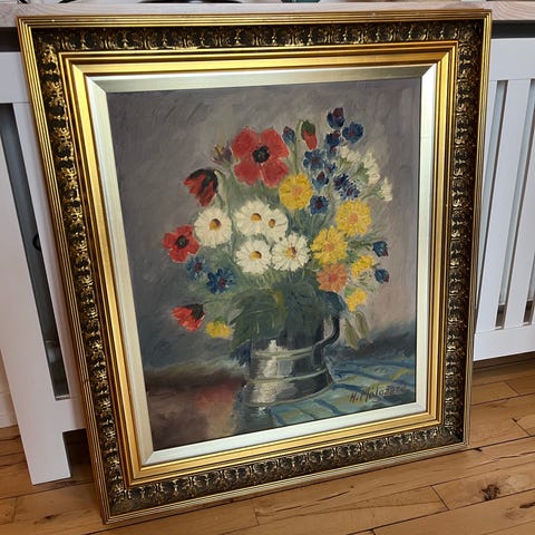 Maleri med blomstermotiv i rektangulær ramme. Motivet viser blomster og blade i dæmpede farver. Maleriet er indrammet i en dekoreret, gylden ramme. Velegnet som vægdekoration i stue, gang eller andre opholdsrum.
