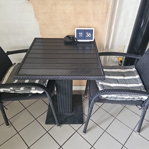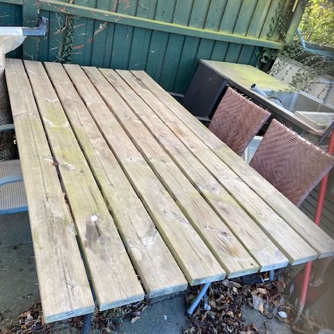 Havebord i polywood materiale, i børstet grå som er lavet af genbrugsplast, men ligner træ. Vedligeholdelsesfrit.
