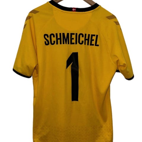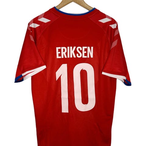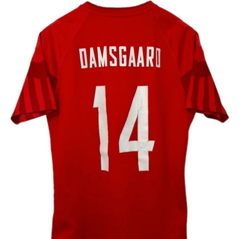 Landsholdstrøje nr. 4 fra de euforiske dage ved EM i 2021. ALLE købte trøjer den sommer, hvorfor vi endte med en trøje i str. XXXXL, som kun har været på i stuen en gang. Trøjerne er meget små i det, så den opleves derfor som en XL/XXL.