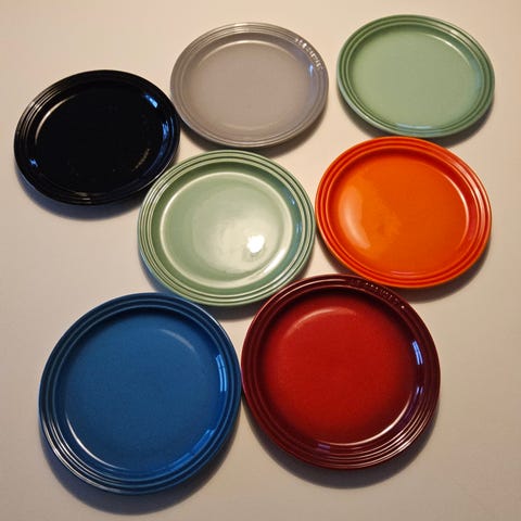 Pæne og velholdte kage tallerkener i farverne sort lilla blå grøn lyseblå grå og ocean.