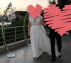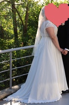 Simpel og elegant brudekjole inkl. slør. Er størrelse 44-46. Jeg er selv 165 cm. høj og bar en sko med få centimeter hæl på.