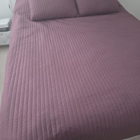 Næsten ubrugt vendbart sengetæppe - 250 x 250 cm og to vendbare puder 90 x 60 cm med lynlås. Stof og fyld er polyester. Afhentes i Værløse