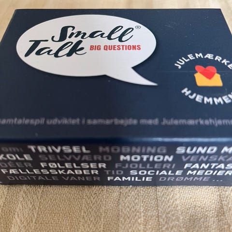 Small Talk - Big Questions stiller spørgsmål til fremtiden, til fantasien og til sjælen. Small Talk - Big Questions handler om at flytte opmærk-somheden fra mobiltelefoner og iPads, til en verden hvor vi snakker, lytter og lærer hinanden bedre at kende. Børn, unge og voksne, få eller mange - alle kan spille med. Tag spillet med i tasken, på ferie, på udflugt Spil det før/under/efter et måltid eller bare næste gang I overvejer at tænde for en spillekonsol eller en smartphone. Rigtig god fornøjelse!