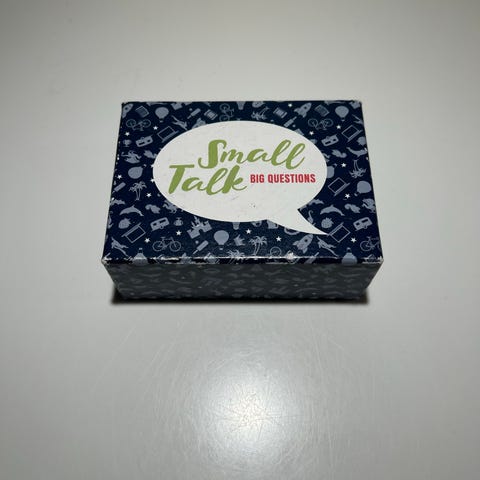 Small Talk Big Questions asks questions for the future, the past, your imagination and your soul. Small Talk - Big Questions" is all about shifting from a world of smart phones and iPads into a world where we talk, listen and engage in one-another. Old or young, few or many - you can all play. Pack the game for your next holiday, use it before/during/after a meal - or just the next time you are thinking about turning on a digital device. Enjoy!