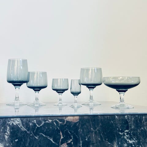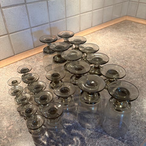 Canada smoke glas sælges: 9 stk. rødvinsglas, 10 stk. ølglas, 12 stk. snapseglas, 12 stk. portvinsglas, 12 stk. champagne/drinksglas, og 2 vandglas. Sælges samlet mm. der gives en god pris på de enkelte glastyper Til afhentning på Amager. Der medfølger 2 Holmegaard lysestager.