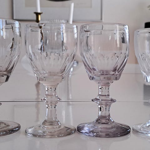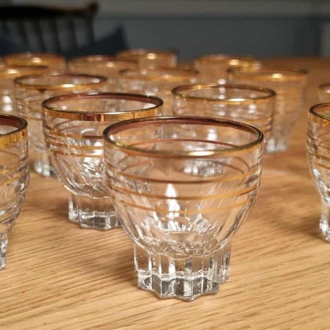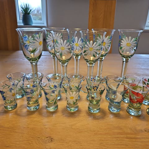4 smukke, blå snapseglas fra Venedig. Sølvdekorationen viser både blomster og gondoler