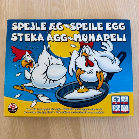 Spejle æg er et spændende og taktisk terningespil for hele familien. Det gælder om at slå med terningen, hvorefter man enten tager eller afleverer æg. Vinderen er den spiller, der først kommer af med alle sine æg. Taberen er den spiller, der til slut sidder tilbage med æg i kurven. Spilletid: Ca. 15 minutter. For 2-4 spillere. Fra 3 år.