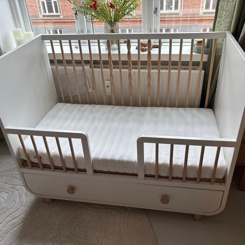 Sengen har aldrig været sovet i, sælges da vi desværre ikke har plads til en tremmeseng, vi nåede at bruge den en enkelt dag som 'kravlegård' hvor vores søn desværre fik lavet et bidemærke i kanten. Når den ene side skal fjernes og den lave side sættes i, kan man jo vælge at fjerne den side med bidemærket. Eller male det ☺️