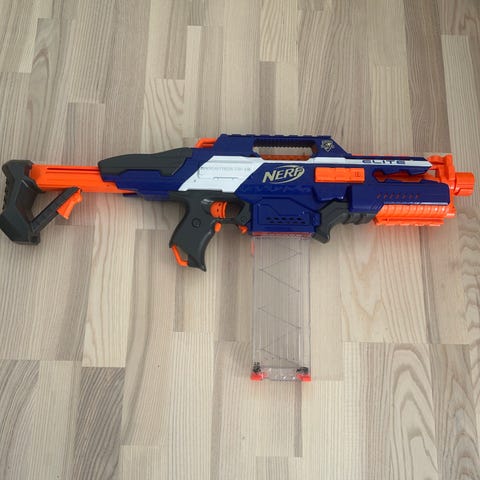 Jeg har en anden NERF - N-Strike Elite, som følger gratis med. Desværre kan jeg ikke finde håndtaget til at spænde den jf. det sidste billede. Den har også et lasersigte, som virker.