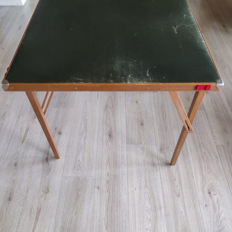 Vintage bridgebord i grøn farve med træramme. Bordet har en grøn filtoverflade, der er velegnet til kortspil eller andre spil. Det er designet med foldbare ben for nem opbevaring og transport. Bordet har en kompakt størrelse, der passer godt i mindre rum.