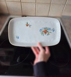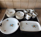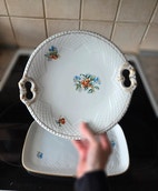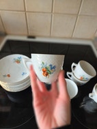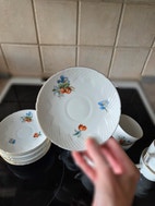 Der er 8 kage tallerkener, 8 underkopper, 8 kaffekopper, et rektanglet fad og et rundt fad