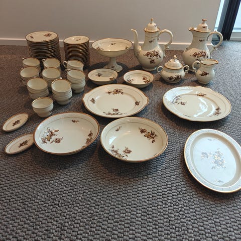 Københavns Porcellains Maleri tesæt i porcelæn med blomsterdekoration. Sættet inkluderer en kaffekande, sukkerskål, flødekande, kop og underkop. Designet er elegant med guldkant og blomstermotiver.