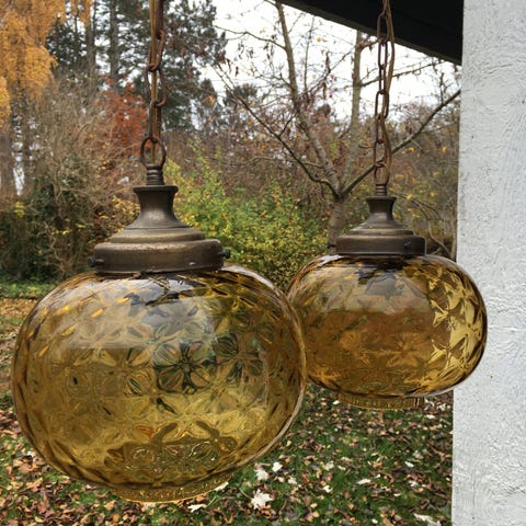 To glaspendler med metal ophæng, ledning og fatning til elpærer. Højde på selve glaskuplen ca 30cm, hele lampen ca 60-70 cm.