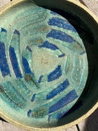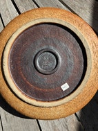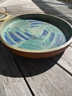 Eva Stæhr-Nielsen (1911-1976) for Saxbo. Stort fad af stentøj, dekoreret med blå og grøn glasur. Drejet af mestersrejer Sigurd Kjær.