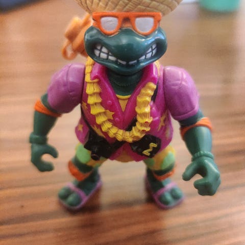 Det er Michelangelo i surfer outfit med solbriller og surfervest.