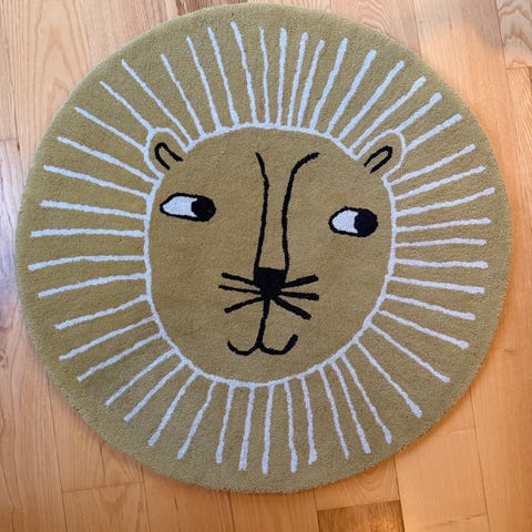 Børne Tæppe formet som løve hoved fra OYOY. Ny pris 800 kroner. Brugt kort tid på børneværelset men der er ingen synlige spor af brug. Sælges for 275 kroner.