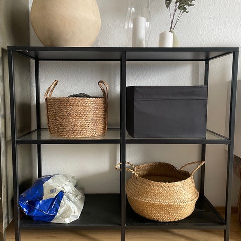 IKEA reol i sort metal. Øverste og nederste plader er sorte og den midterste er glas.