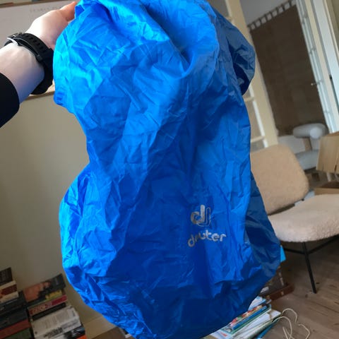 Der er et lille hul på 2-3 mm i regnslaget under bunden af rygsækken, så det har ikke den store betydning.