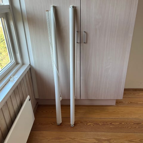 Rullegardin i hvid. Meget slidt, med enkelte huller i, men virker i øvrigt fint, gives væk gratis