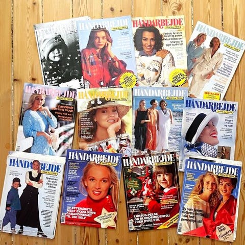 To flotte retro håndarbejdsmappers fra 1982 fra Allers Forlag, kaldet "Populært Håndarbejde." Det drejer sig om bind 1 (Strik) og bind 3 (Syning). Mapperne indeholder originale faneblade med strikmodeller, syskole, symodeller, batik og meget mere.