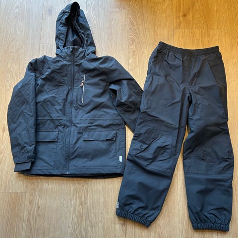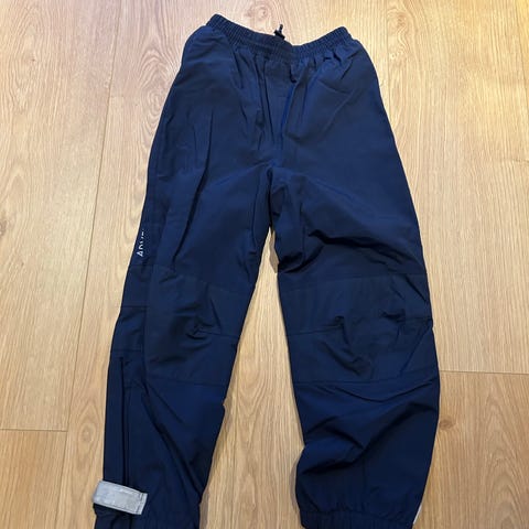 Sorte skalbukser med seler. Gode til det kommende fugtige efterår. Bukserne er anvendt i stedet for regnbukser. Teksten på siden af det ene bukseben er lidt slidt (se billede 6), men ellers minimal med synlig brugsspor.